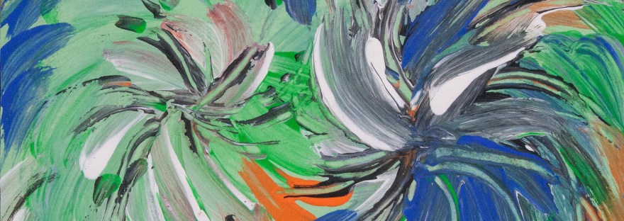 Fluid abstract dynamic image with energetic vortex movements in tones of orange, green, blue, black and white colors.